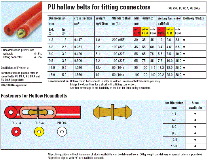 - PU Hallow Round Belts : Brass (황동) 커넥터 연결방식으로 현장에서 손쉽고 빠른 조립이 가능한 벨트, FDA. USDA 인증