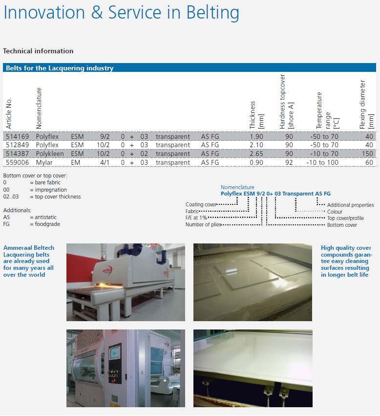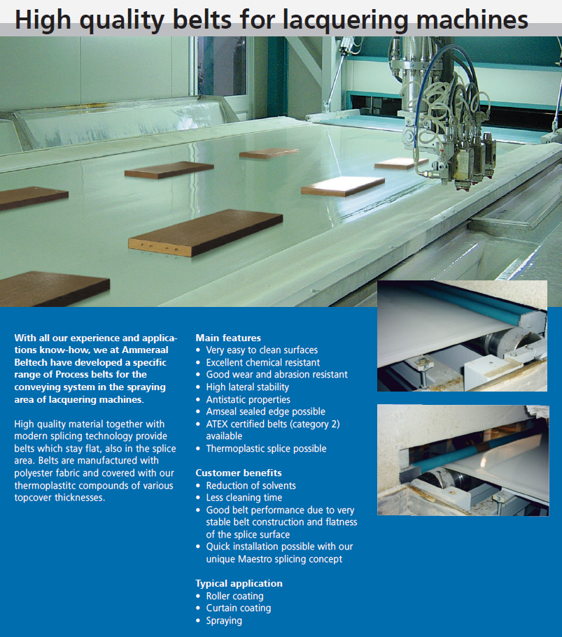 코팅라인용 우레탄벨트 2015/08/132017/07/17 beltron 코팅라인용 우레탄 컨베이어벨트 / 라커링머신용 우레탄벨트 라커링 머신용벨트 / 스프레이 코팅 라인 / 커튼 코팅 라인 / 롤러 코팅 라인에 적합 내화학성이 매우 우수하고 특수 복합 소재의 커버적용을 통해 벨트 표면의 세척성이 매우 우수함 대전방지 타입의 벨트로 ATEX인증 벨트, 열가소성타입으로 현장접착이 용이함